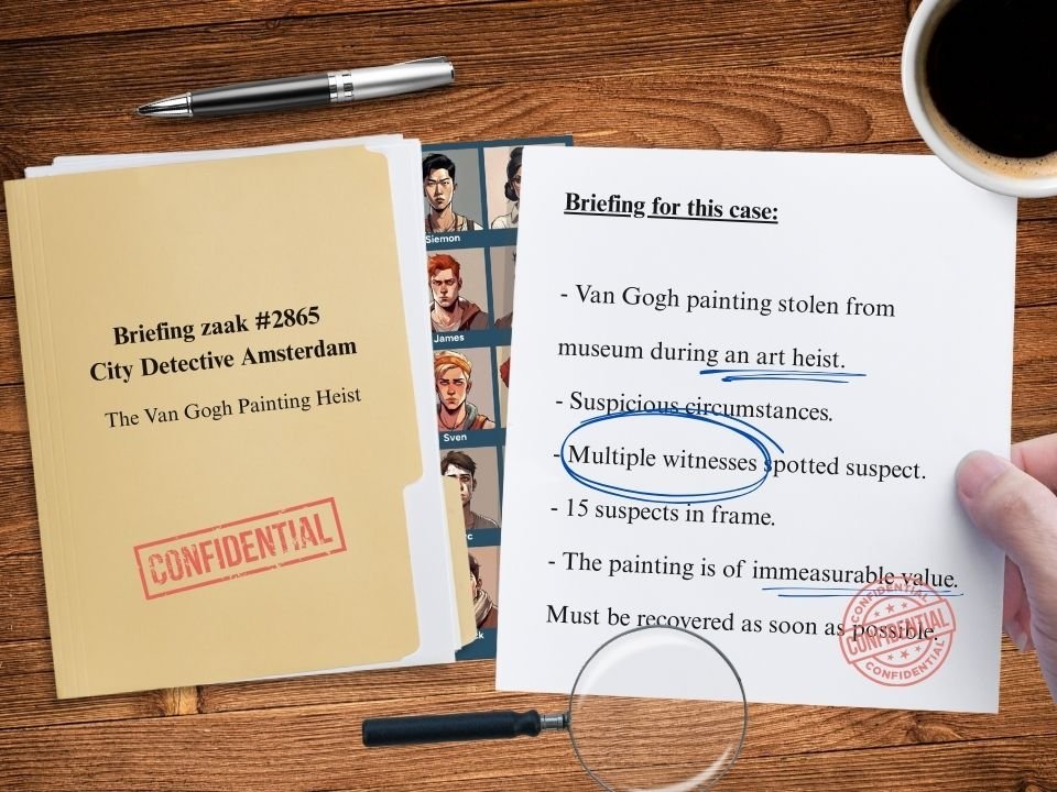 With City Detective Amsterdam, you’ll dive into the mystery of the stolen Van Gogh painting. Explore hidden locations in the city, tackle challenges, and eliminate suspects from the list.